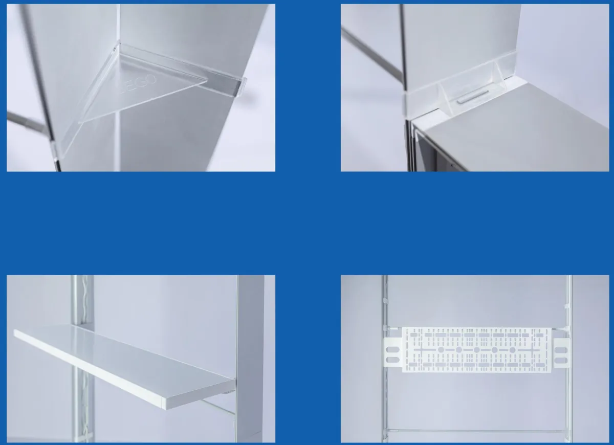 Connect frames to build corners and connect different heights. You can put shelves on the frames for monitors and giveaways. They are east to accessorize!